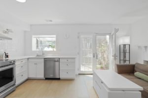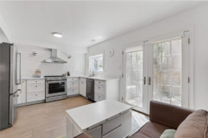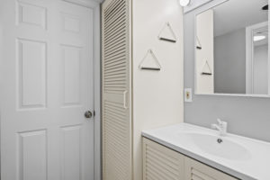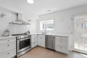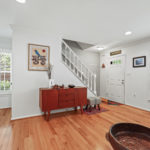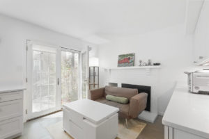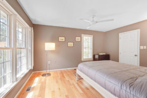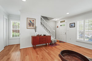 Rarely available, Bristol model, 2BR/3.5BA end-unit townhome in Windgate II with three finished levels. The main level features hardwood floors, recessed lighting, and a fully renovated kitchen with white cabinetry, quartz countertops, subway tile backsplash, stainless steel appliances, porcelain tile floors, and a wood-burning fireplace. French doors open to a private, fenced-in patio with southern exposure. There's also a main-level powder room with an updated vanity and fixtures.